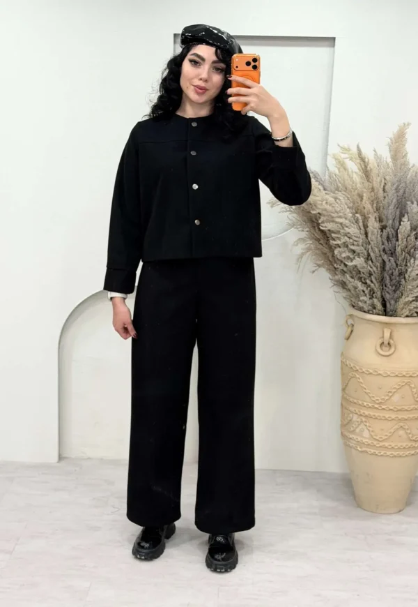 ست کت‌ شلوار گیلدا با طراحی خوش دوخت و هماهنگ خود، استایلی شیک و زنانه ایجاد می‌کند. پارچه باکیفیت و ایستایی تمیز آن باعث می‌شود فرم کت و شلوار روی تن بسیار مرتب و جذاب دیده شود. جزئیات ظریف دوخت در کنار برش دقیق، این ست را برای موقعیت‌های روزمره شیک و حتی مهمانی‌های سبک به انتخابی ایده‌آل تبدیل کرده است. ترکیب متعادل راحتی و وقار، گیلدا را به گزینه‌ای بدل می‌کند که هم کاربردی است و هم جلوه‌ای آراسته و اعتماد به ‌نفس ‌بخش به استایل شما می‌دهد.